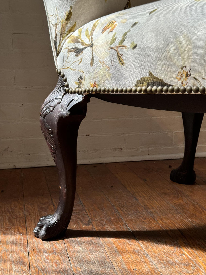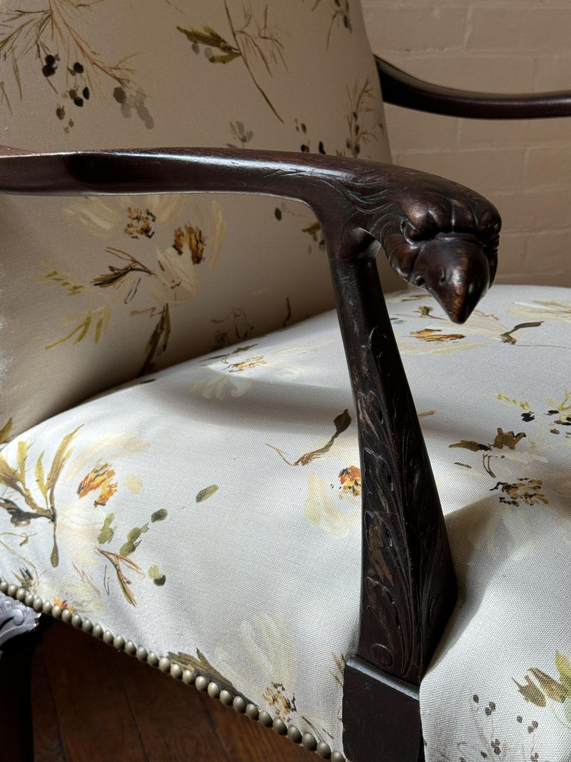 For the new upholstery, we chose a printed linen by Kelly Ventura. The print was reminiscent of the original brocade and felt like a modern version of that elegant design. We especially liked how darker parts of the print picked up the color of the mahogany frame.