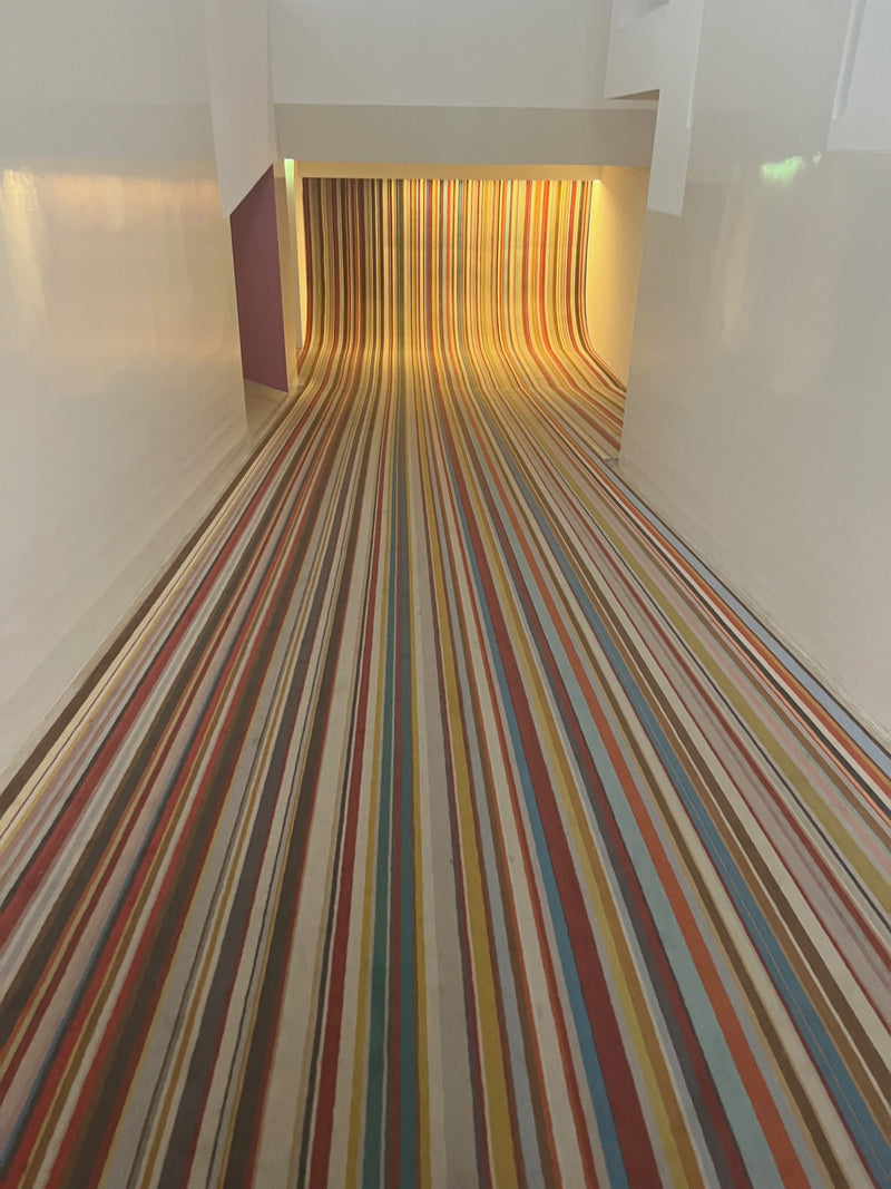 When I was in Paris last month, I visited the exhibit curated by fashion designer Paul Smith, Picasso Celebration: The Collection in a New Light, at the Musee Picasso. Paul Smith was asked to show Picasso ‘in a new light’ on the 50th anniversary of Picasso’s death (quite a different take than the one provided by Hannah Gadsby at the Brooklyn Museum). Above is a corridor at the exhibit fully carpeted in Paul Smith’s signature stripe.