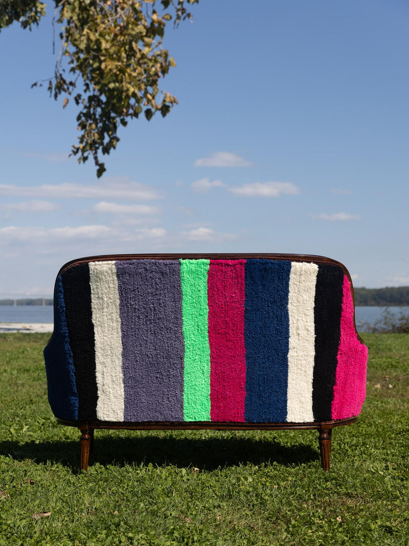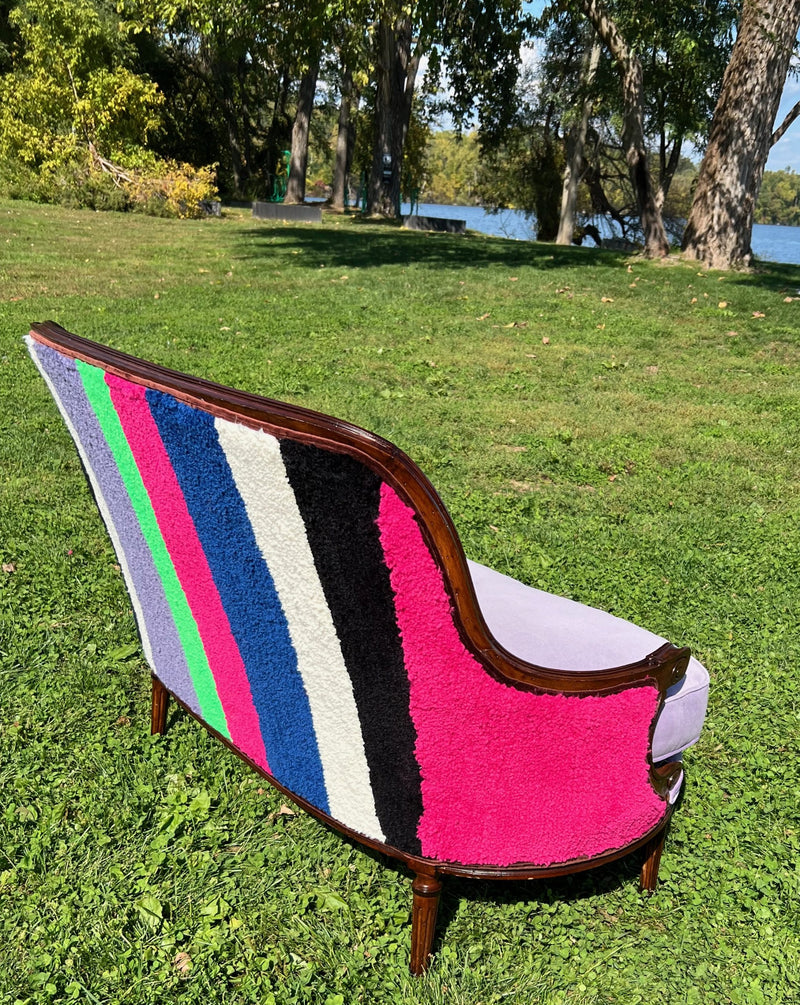 The final settee is shown above. The vibrant colors and touch of violet and splash of lime green are both chic and daring. I used a lilac velvet on the front of the settee which adds elegance to juxtapose the boldness of the tufted textile on the back.