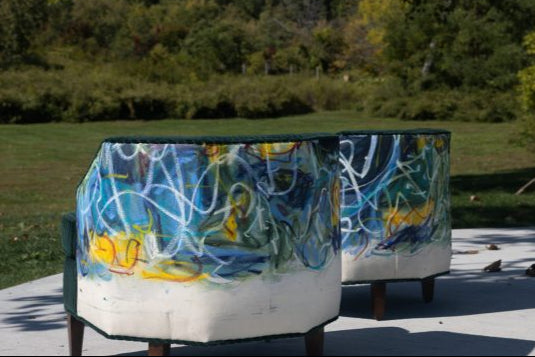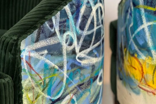 Michelle painted the piece below using a coated canvas that is easy to manipulate; her regular canvases are much stiffer. We decided to cut the finished piece in half and use it on the backs of the two chairs. The negative space along the bottom emphasizes that this is indeed an artists’ canvas. The thick corduroy velvet from Maharam creates a soft and luscious contrast to the chairs’ graffitied backs. The deep green plays nicely off the yellow in the painting.