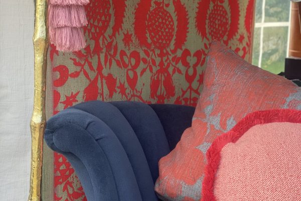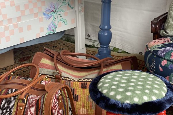 A very last minute decision was to take a bunch of old vintage stools I had and use our remnants to reupholster them. I wanted then to be extra special so we lacquered the legs and bought trims from Samuel and Sons to dress them up a bit. These colorful little stools are now singing with joy. I was delighted when a young girl no more than 6 came into our booth and insisted that her mom buy it for her.