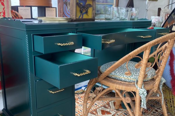 I spent a lot of time this spring choosing which of my pieces to feature. I decided to showcase more case goods along with upholstered pieces. Last summer I found the sweetest little vintage desk out on Long Island and decided to have it lacquered in a deep teal by Benjamin Moore. The inside of the drawers are several hues lighter creating a pleasant surprise when you sit down and open them. We took a few of our side tables and lacquered them as well. One has a gold leaf trim along the contour and another is painted antique blue with a poppy color trim detail.