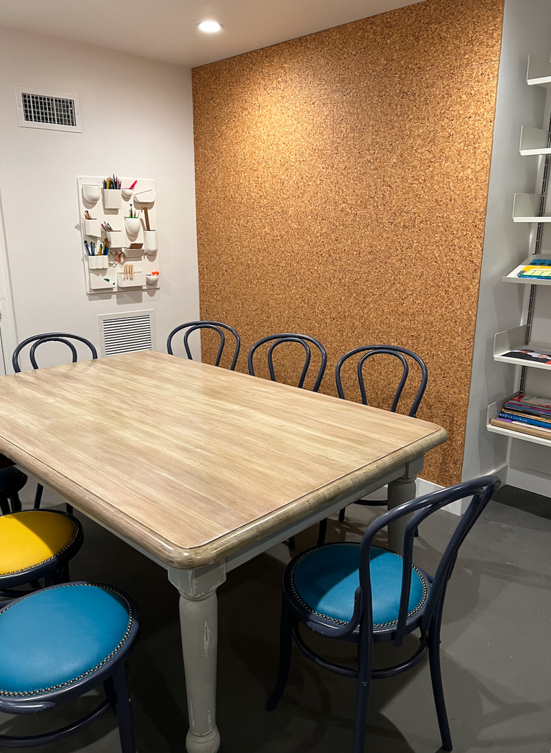 Above is a picture of the eight refinished Thonet/Bentwood chairs around my client’s art table. We upholstered them in a vinyl by Knoll so that they’d be easy to clean. We chose the blue and yellow color palette to keep the space cheerful and fun.