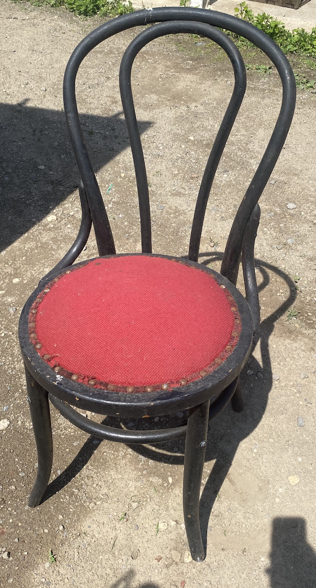 The picture above features one of the chairs in its original state. The wood was split and cracked in some areas, but these chairs are so sturdy that they were worth reinforcing and refinishing. Thonet developed a technique to create Bentwoods: solid beechwood is steamed at over 200 degrees Fahrenheit and then clamped into a cast iron former. The beech is then dried for at least twenty hours. I don’t know the birdthdate of these Thonets we refinished but I’m guessing they’re at least 75 years old.