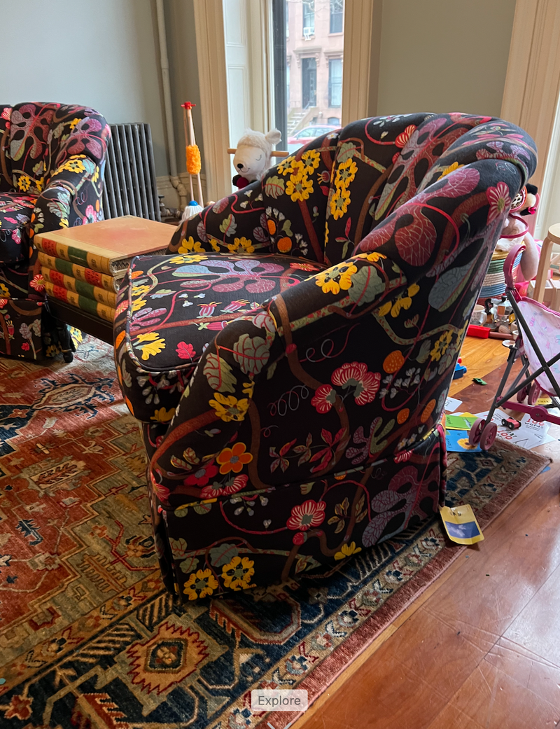 This style is just a bit different than the increasingly popular design aesthetic, Cluttercore, which is all about displaying everything that you have and love. This is about embracing the chaos of daily life with exuberant design elements. For those of us with lives that are filled to the brim, this approach makes a lot of sense. The two swivel chairs in my client’s parlor room, pictured above, distract the eye from any disorder that may be surrounding them creating a camouflage effect.