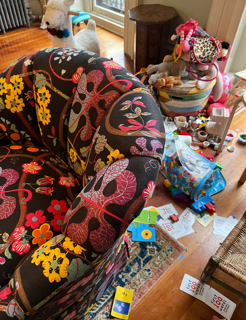 Like me, my client has two kids (one which is on the way). Keeping the house perfect is not realistic. To be honest, my client really liked this print and already had her heart set on it when she came to me. But I relate to it in how it reflects the wild energy of a full life. By adding more pattern and lively color to my client’s living space, we are ‘camouflaging the chaos’.