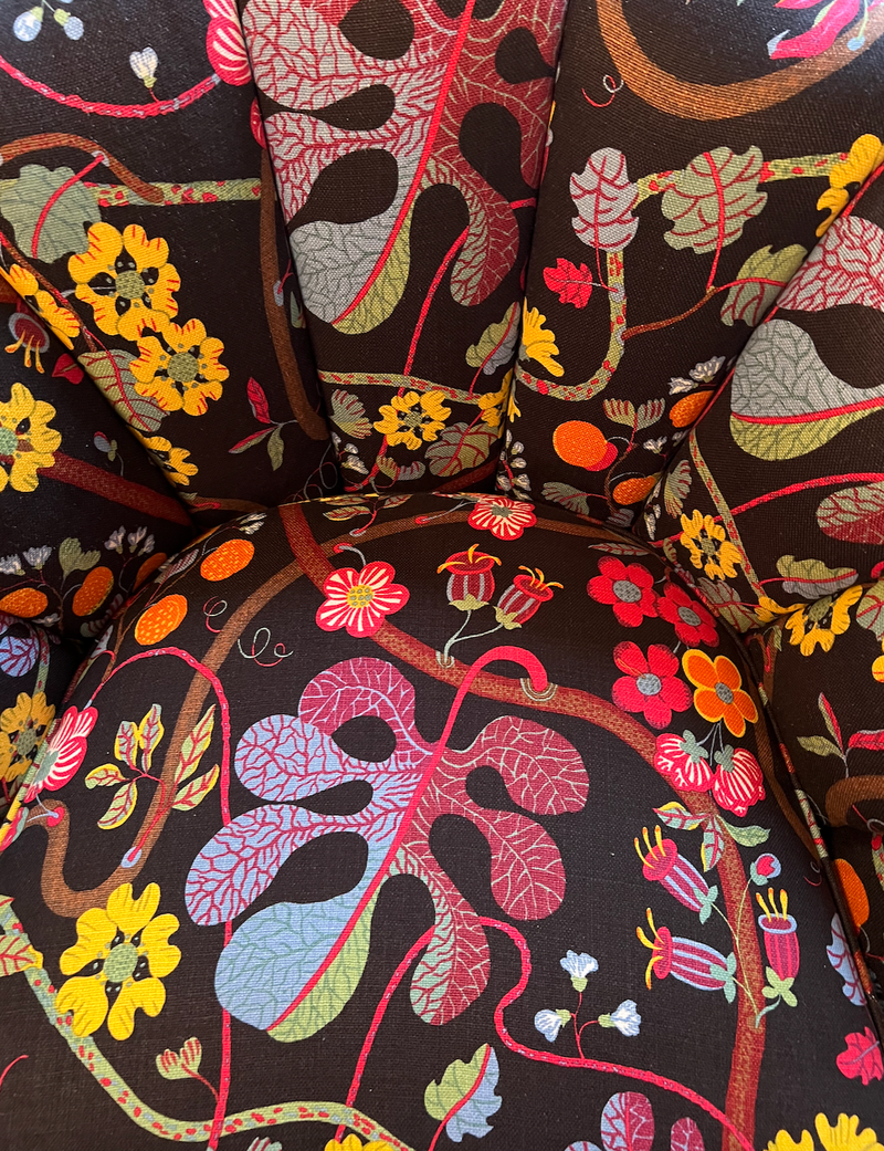 We recently completed a pair of channel-back swivel chairs for a local client who chose the Branquilla print by the late Viennese architect Josef Frank. The pattern is so bold, exuberant, and modern-looking that you would never guess it’s 100 years old.