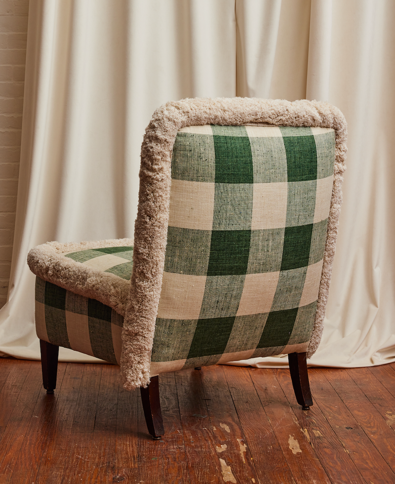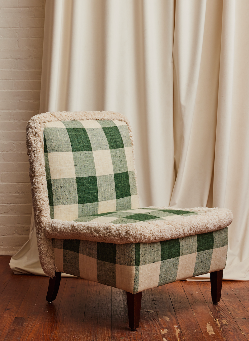 This is an oversized checkerboard chair we created for our collection of restored pieces. I love a crisp, clean, checkered pattern and how it holds its own in a room.
