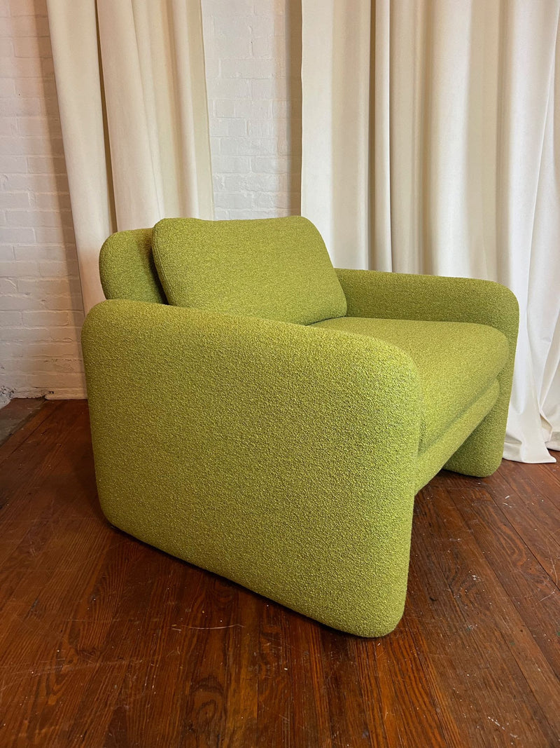 The above Chiclet we recently reshaped and upholstered for local designer, Nick Spain. The celery green boucle feels very midcentury, which is when Chiclets were created.