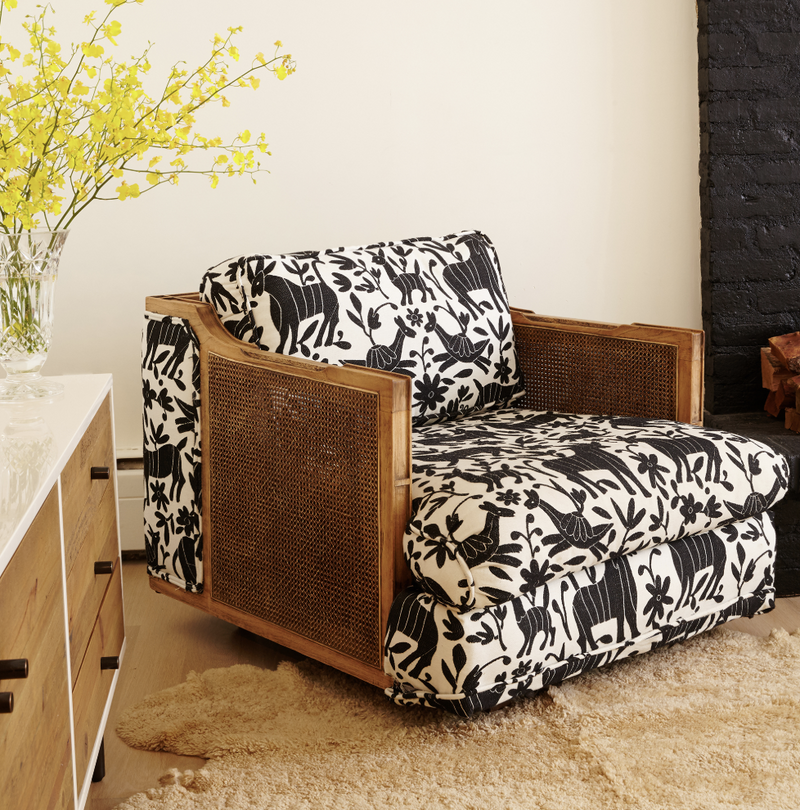 I went on a textile journey to choose the fabric and settled on a woven Mexican Otomi pattern. I stripped the wood and did everything in my living room.