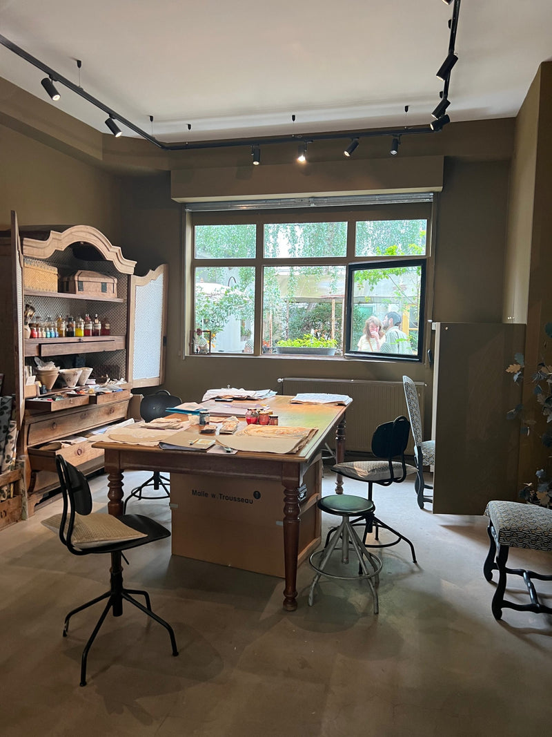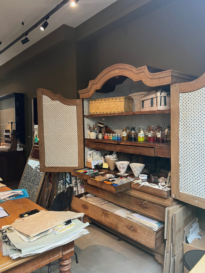 On my list of must-do’s was to visit the design studio and show room of the textile house, Antoinette Poisson. Walking down a quiet street in the 11th, I thought we had the wrong address, when Audrey figured out it was tucked away in a hidden courtyard. Behind two grand wooden doors we found chez Antoinette Poisson.