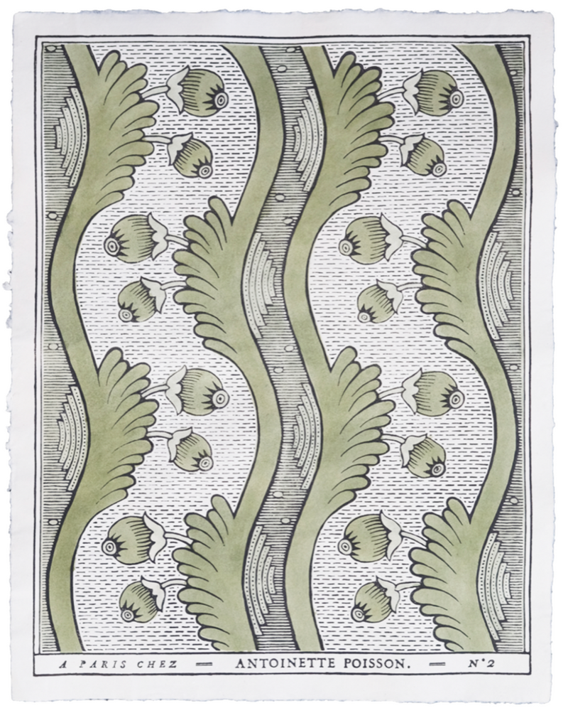 Antoinette Poisson launched in 2012, which makes them a young textile house. The founders, Jean-Baptiste Martin and Vincent Farelly, are two wallpaper conservators who discovered Domino printing, an 18th century technique for producing original wallpaper, while restoring a house in Auvergne. “Dominos” are small–12″ x 16″–and are hand-painted with unusual designs. They’re often used to adorn small nooks and crannies, closet walls, the bottoms of drawers, and the inside covers of books.