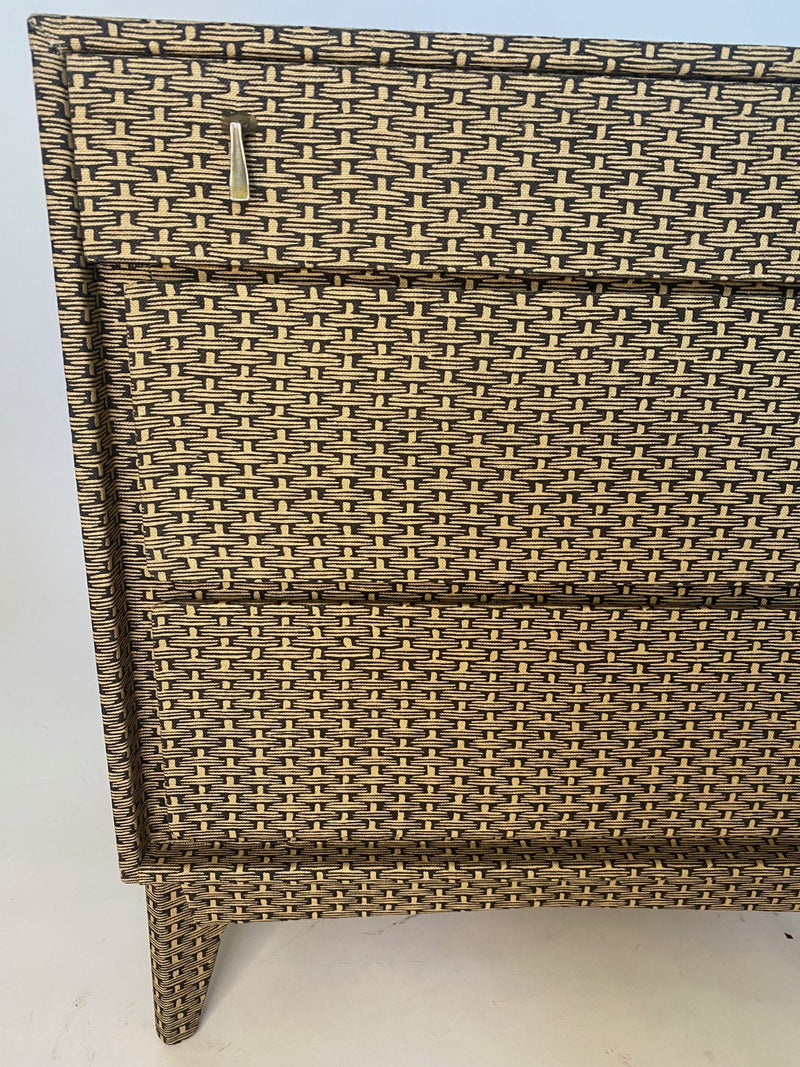 I designed this simple chest of drawers below with fabric from Antoinette Poisson last Spring. The basketweave print is a ‘trompe l’oeil’, an optical illusion. It looks like an actual woven piece of wicker furniture but in fact it’s a two-dimensional flat piece of fabric. This chest of drawers is for sale here on my website.