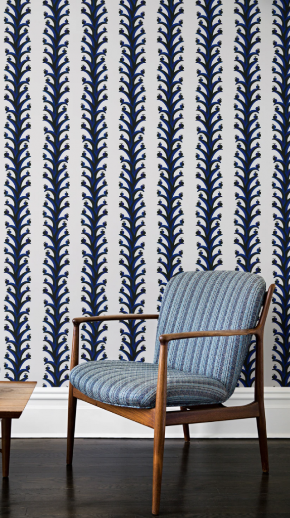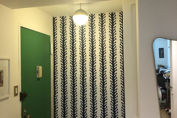 The entryway gets a lot of use with two kids, scooters and daily life in general. We painted the door a cheerful green (BM Green with Envy) to hide any scuffs and add a bit of pop to the space. The walls were wallpapered in a stripe by the Brooklyn artist, Wayne Pate, which added height to the space.