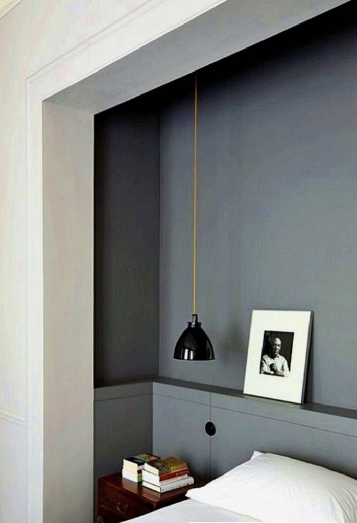 White paint isn’t the only color that works well in small spaces. In the bedroom the ceiling soffit creates a nook where the bed is located. We decided to paint the nook BM Aegean Teal. This added a coziness and warmth to the space and really makes you want to snuggle up in bed!
