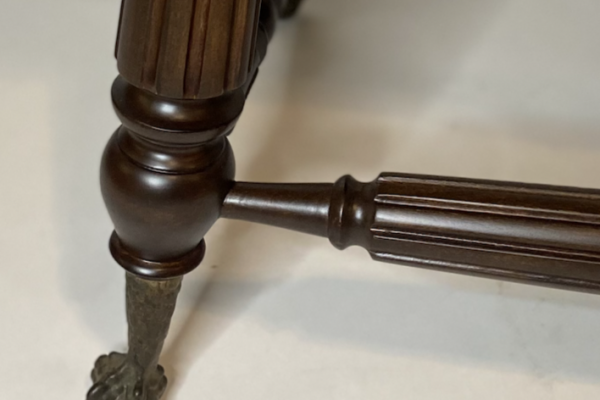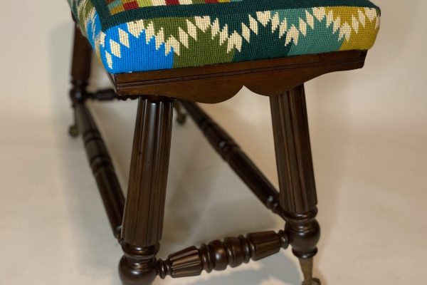 On a trip to Broomfield I spotted a vintage wood-framed bench that had the most spectacular brass clawfeet and a carved mahogany frame. The measurements were right and I knew this was it. The upholstered top was the original needlepoint from at least 100 years ago, maybe more! It always amazes me how a piece of furniture can stay beautiful for a century. It was a coincidence that the top of the bench happened to be needlepoint but it was also a sign that quality hand stitched design has longevity. This was the perfect way to create a new family heirloom.