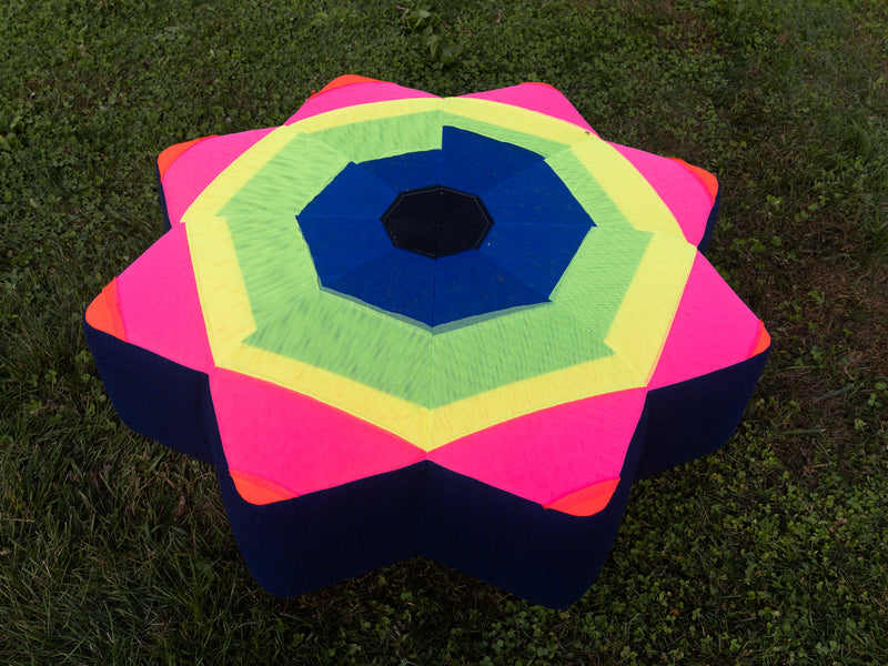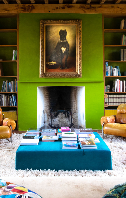 The ottoman above also plays with shape and color. The turquoise and the oversized scale help ground the acid green fireplace and anchor the space. This bright and beautiful ottoman is the coffee table of today.