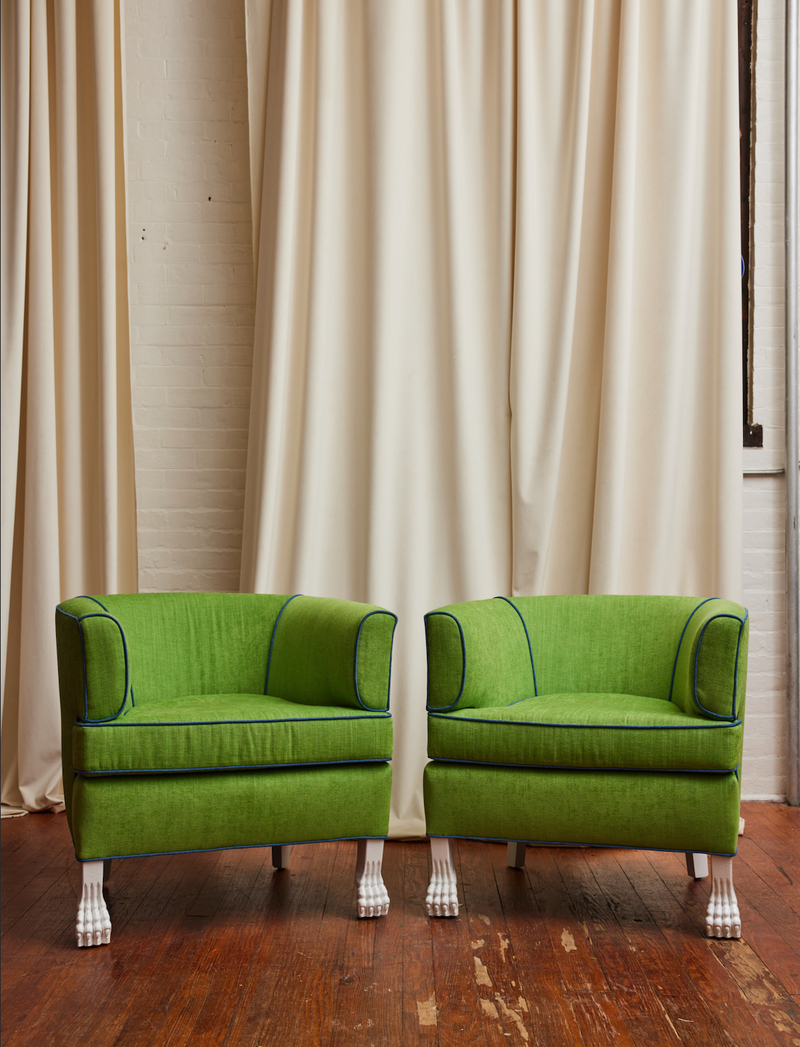 I love a pair of club seats, especially these two with their feline feet and contrast piping.