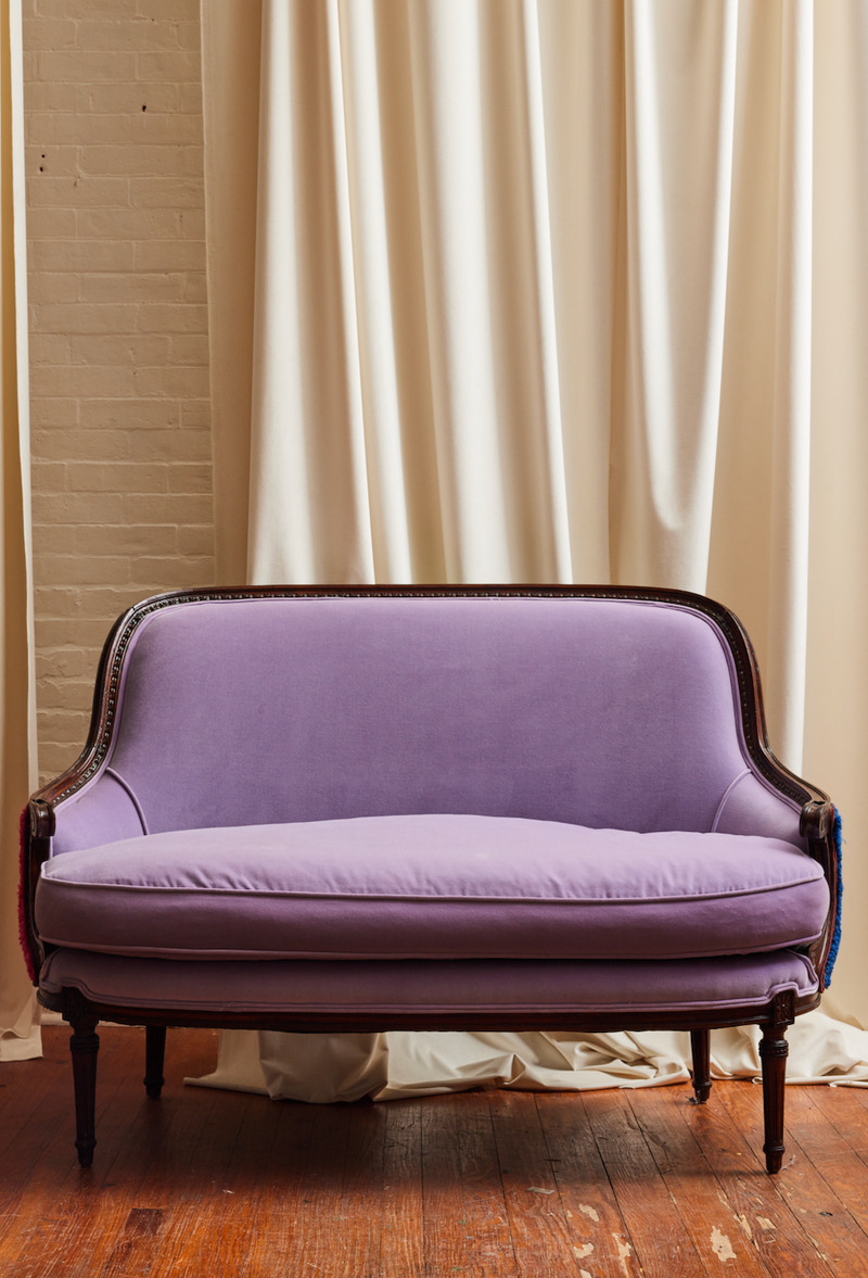 The settee’s front is a lavender velvet. The classic two-seater is chic plus, with its down-filled cushions, great for a quick nap.
