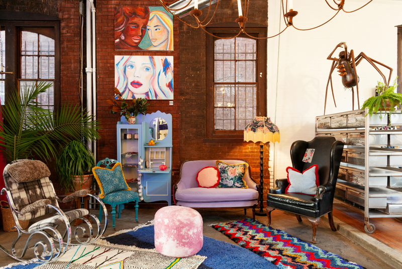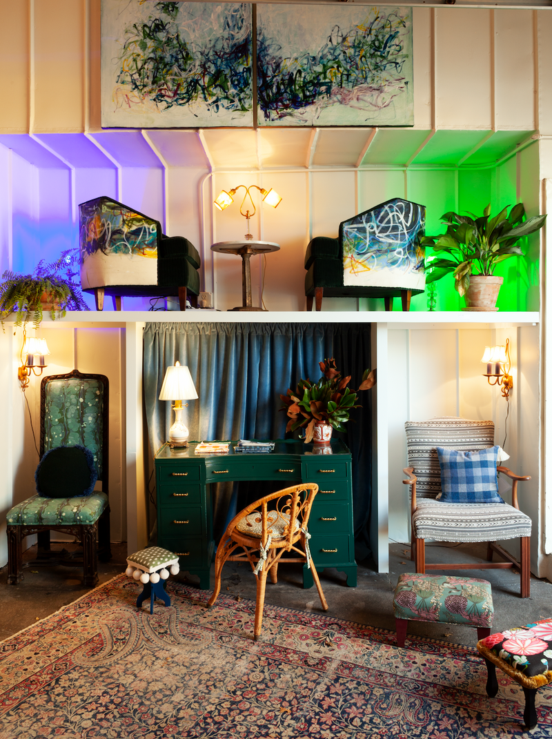 There was a wonky radiator hung on an alcove wall that I covered with a velvet curtain. We divided the wall space into four separate alcoves and added lighting to create individual spaces for showcasing finished furniture. The artwork on the chairs above and the wall is by Brooklyn artist, Michelle Mannix.