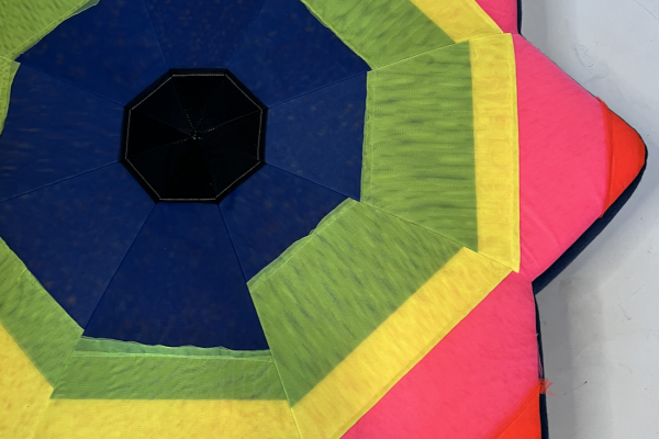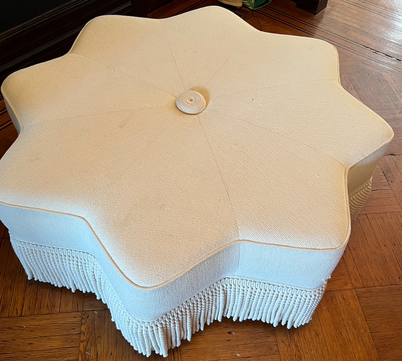 The ottoman itself is a wild piece that I snatched up at a sale on the North Fork of Long Island. It’s big enough to curl up and take a nap on and consists of eight big rays. We decided to layer five or six layers of tulle and overlap colors creating secondary and tertiary colors on the star’s rays.