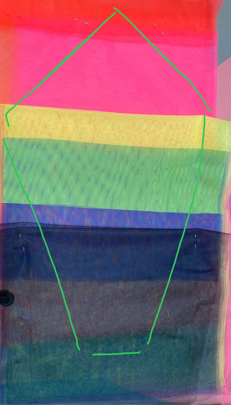 We decided to work together on a few custom pieces of furniture. Mariadella often works with tulle to create collages. Above is one of her tulle installations. Her textile work focuses on color relations and how layers and textures work together to create illusions of new colors and forms. We wanted to play with this technique using tulle in a variety of colors. I had a star-shaped ottoman that I’d been waiting to redesign and this seemed like the perfect blank canvas.