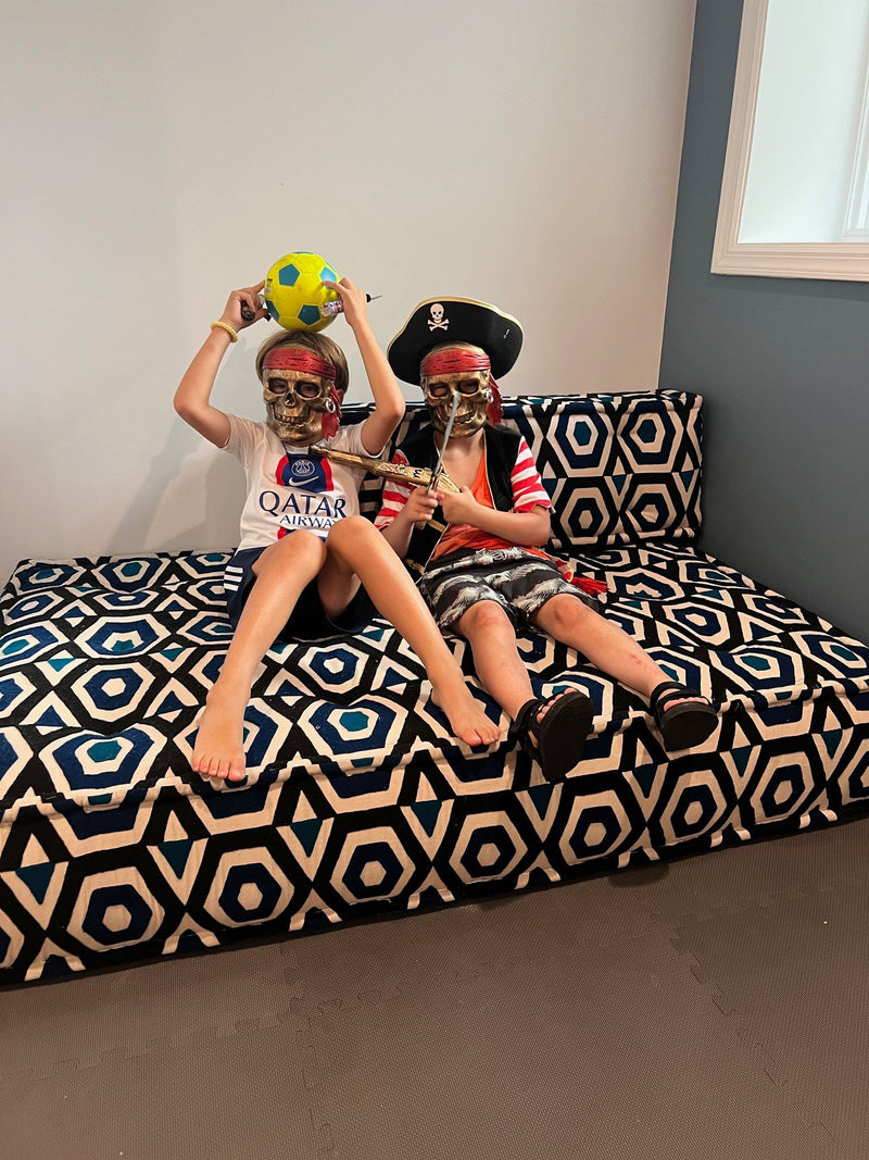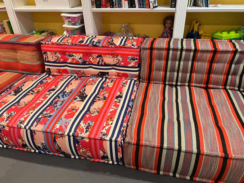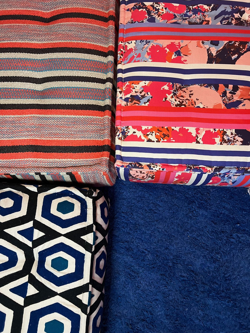 I’ve been working on a fun project for a favorite client on the North Fork, in Southold. We’ve been working to transform the basement of their house, which is a stone’s throw from the beach. My clients wanted to turn the basement into a playful, dynamic space where their elementary school-aged kids can play, move French mattresses around to create forts, and put artwork on the walls. Above we mixed textiles from Pierre Frey, Kravet and Kristy Stafford on a set of interchangeable floor cushions.