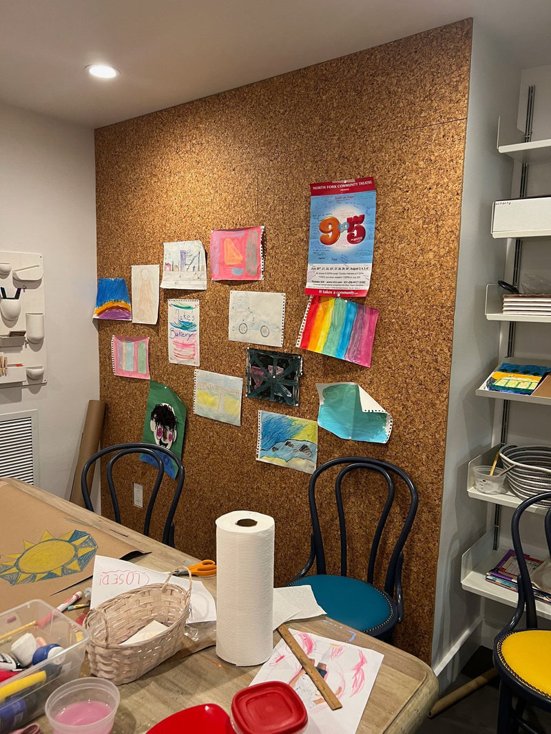 We added a cork wall for posting artwork in another corner of the basement. We restored these Thonet chairs–they were lacquered in a high gloss and upholstered with faux leather from Knoll for easy cleaning. The shelving on the right is from Vitsoe.