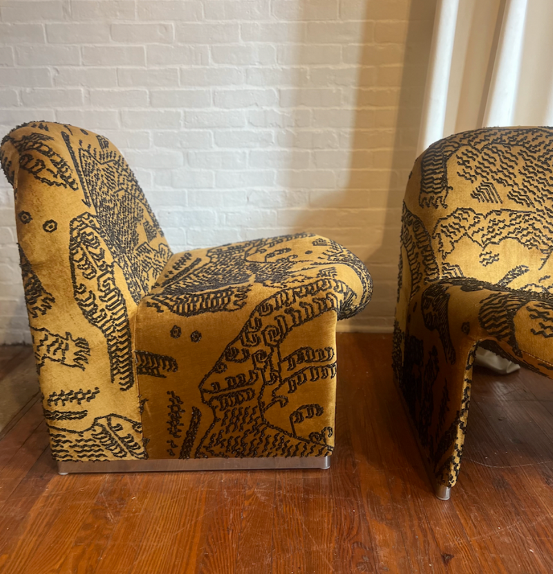 We had wanted a pair of sleek and sexy, low-slung accent chairs for our client’s living room. Nothing over-stuffed or traditional.