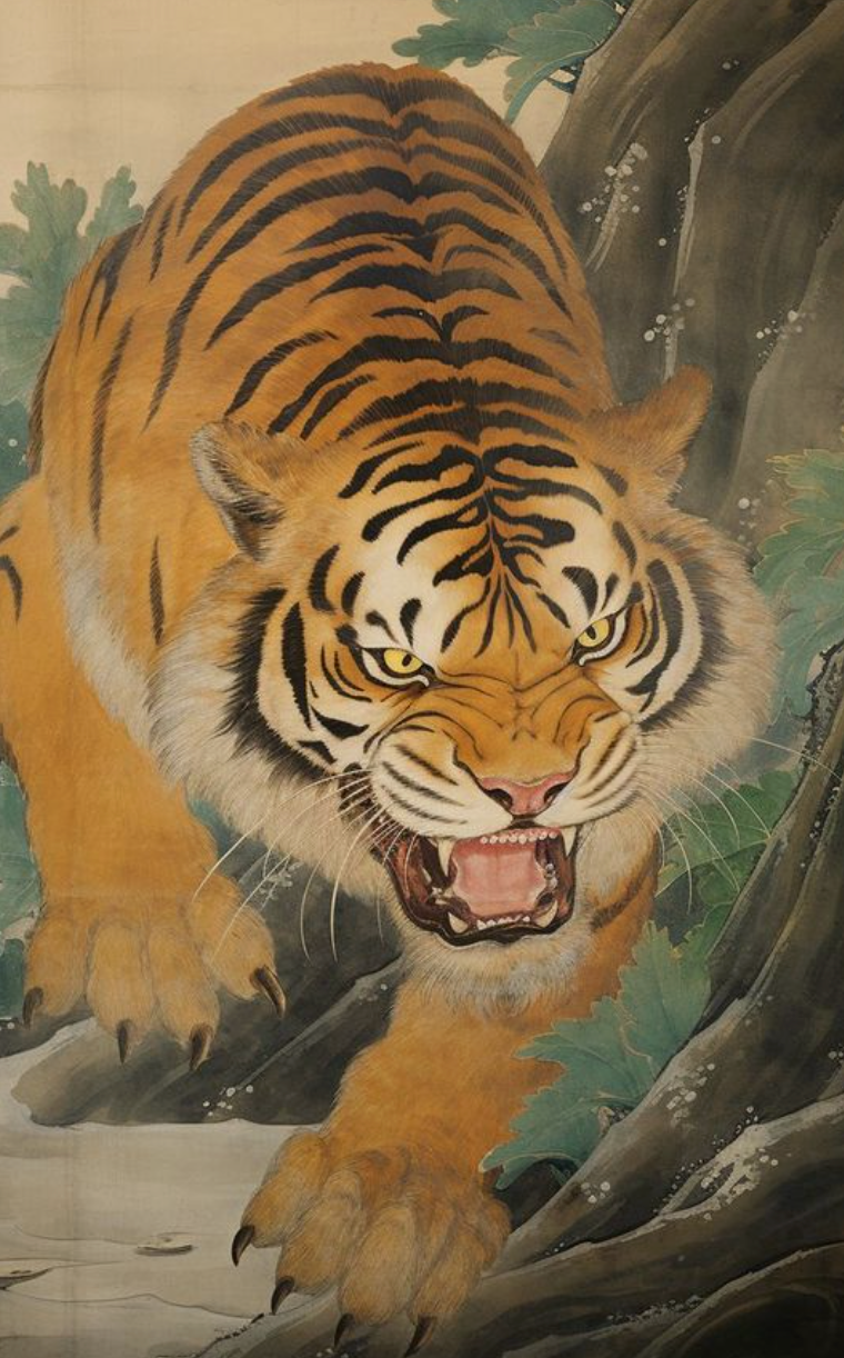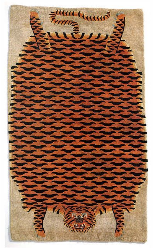 Tiger Mountain fabric is a beautiful and imaginative interpretation of magical tigers at play. It was inspired by vintage Tibetan tiger rugs like the one featured above.