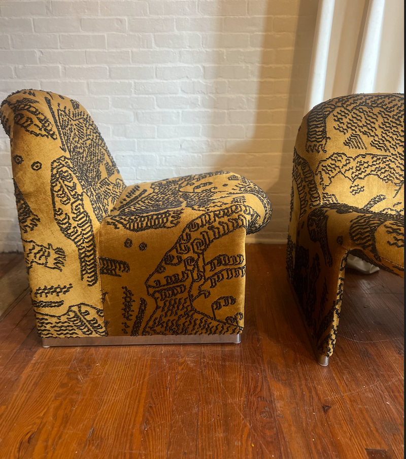 We fell in love with the curvaceous silhouette of these two 1980’s slipper chairs that we sourced for a client’s living room.