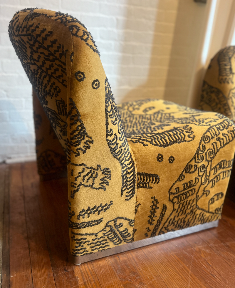 We chose to do these beauties in Tiger Mountain fabric. Combined with the chairs’ low-slung elegance, the Tiger Mountain fabric makes these pieces unforgettable.
