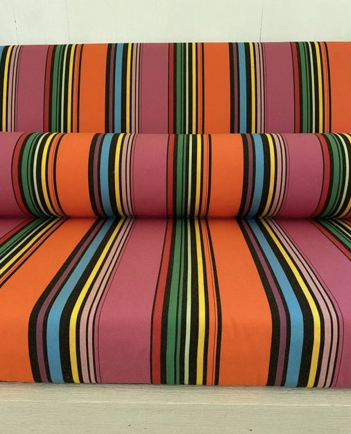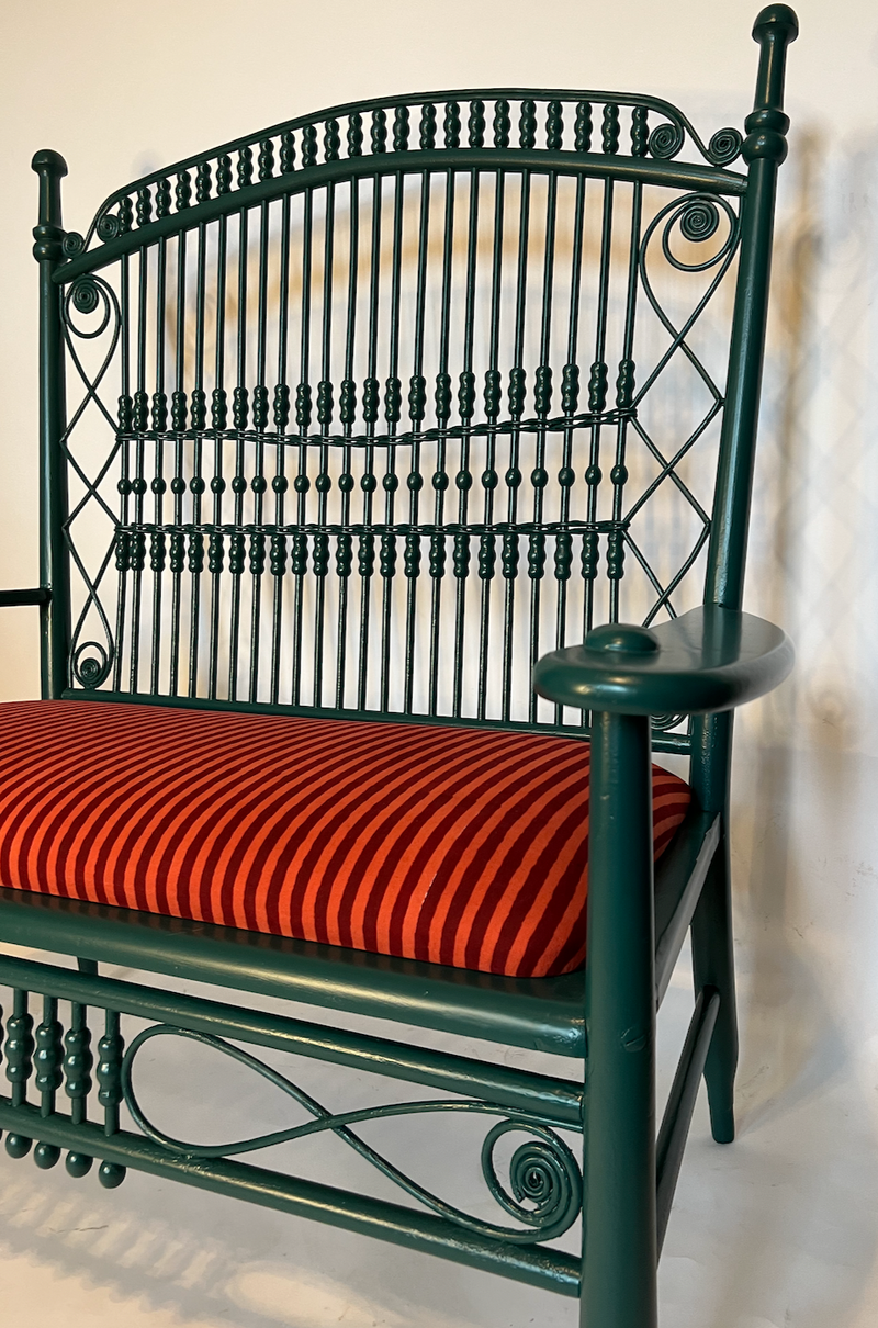 We recently restored and reupholstered the bench above. The frame’s intricate shape is unique and pretty. I wanted the seat fabric to mimic the lines created along the backrest. The Lisa Corti simple stripe I chose works well with the bench because the scale is similar to the lines within the frame. The color is playful and adds energy to the piece. This piece is for sale here on my website.
