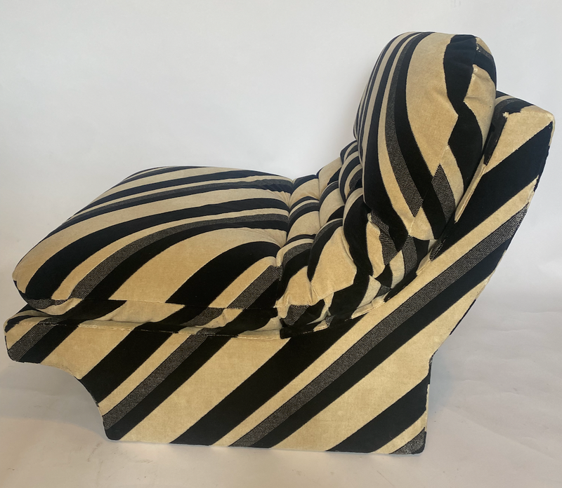 The lounge chair above is by Vladimir Kagan and the fabric is by Kelly Wearstler. Here the pairing of midcentury modern with a plush retro striped velvet is dramatic and bold.