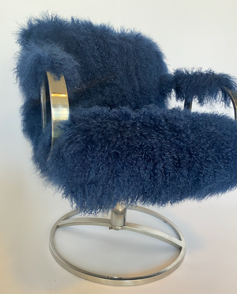 This funky chair above has the classic Milo Baughman flat metal shape, but instead of a cantilever seat there’s a pedestal base that swivels. The soft fur is a nice juxtaposition to the metal frame.