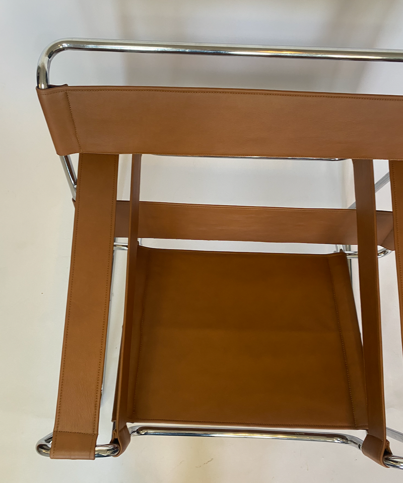The Brno is a contemporary classic designed by Ludwig Mies van der Rohe and Lilly Reich. The steel frame is a single piece bent into a C-shape from the middle of the back.