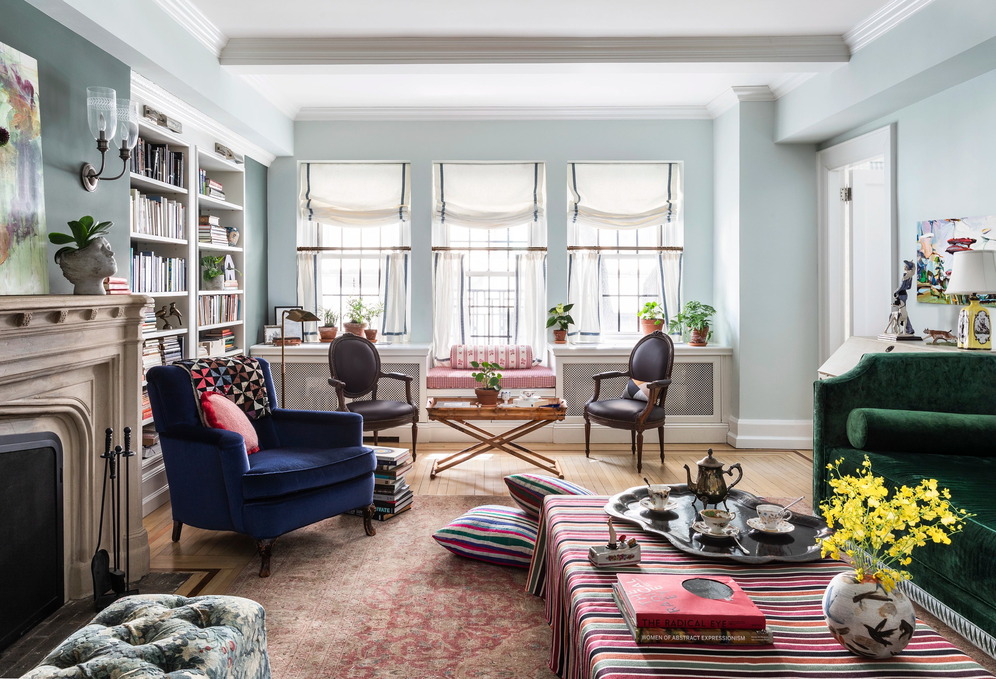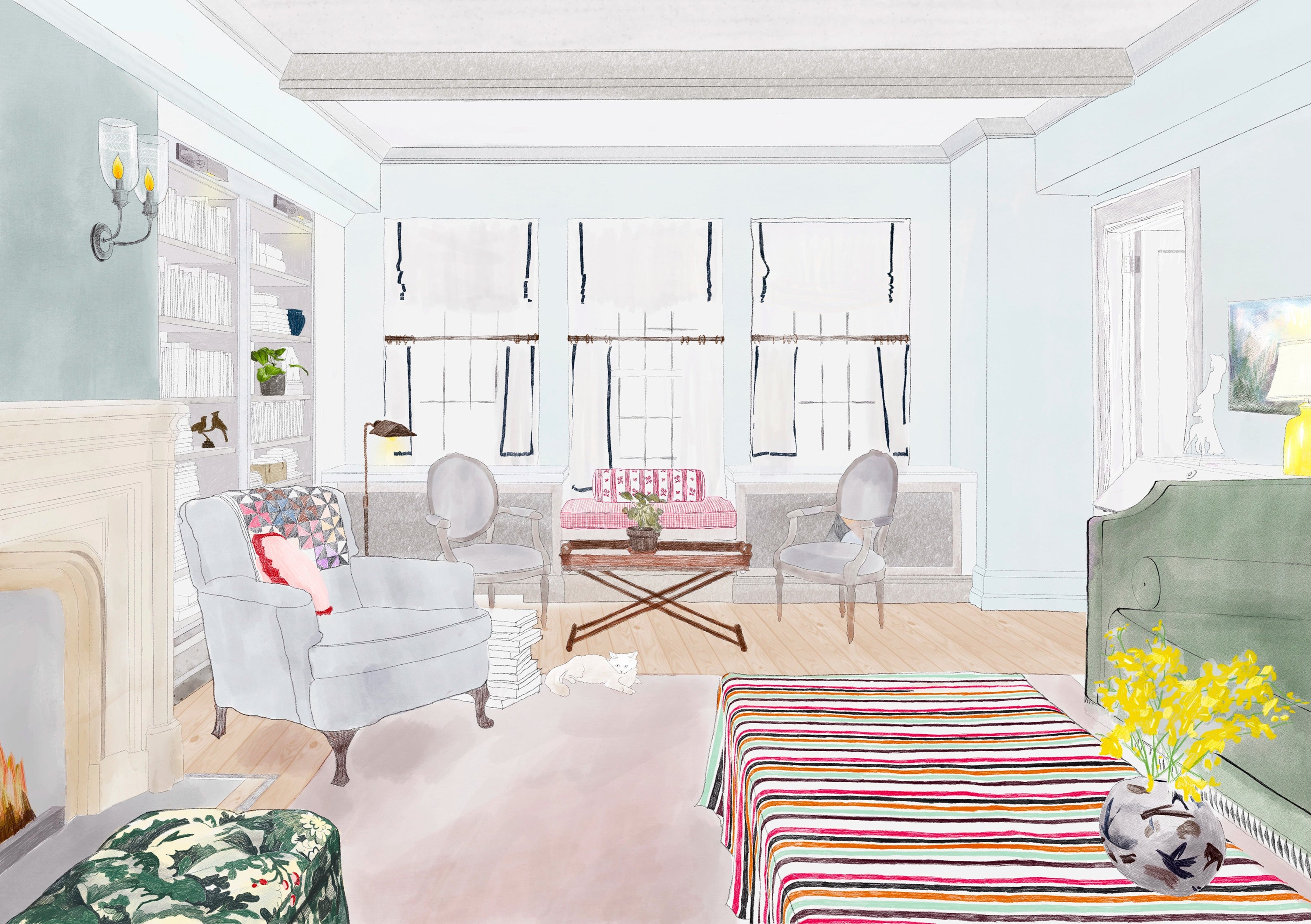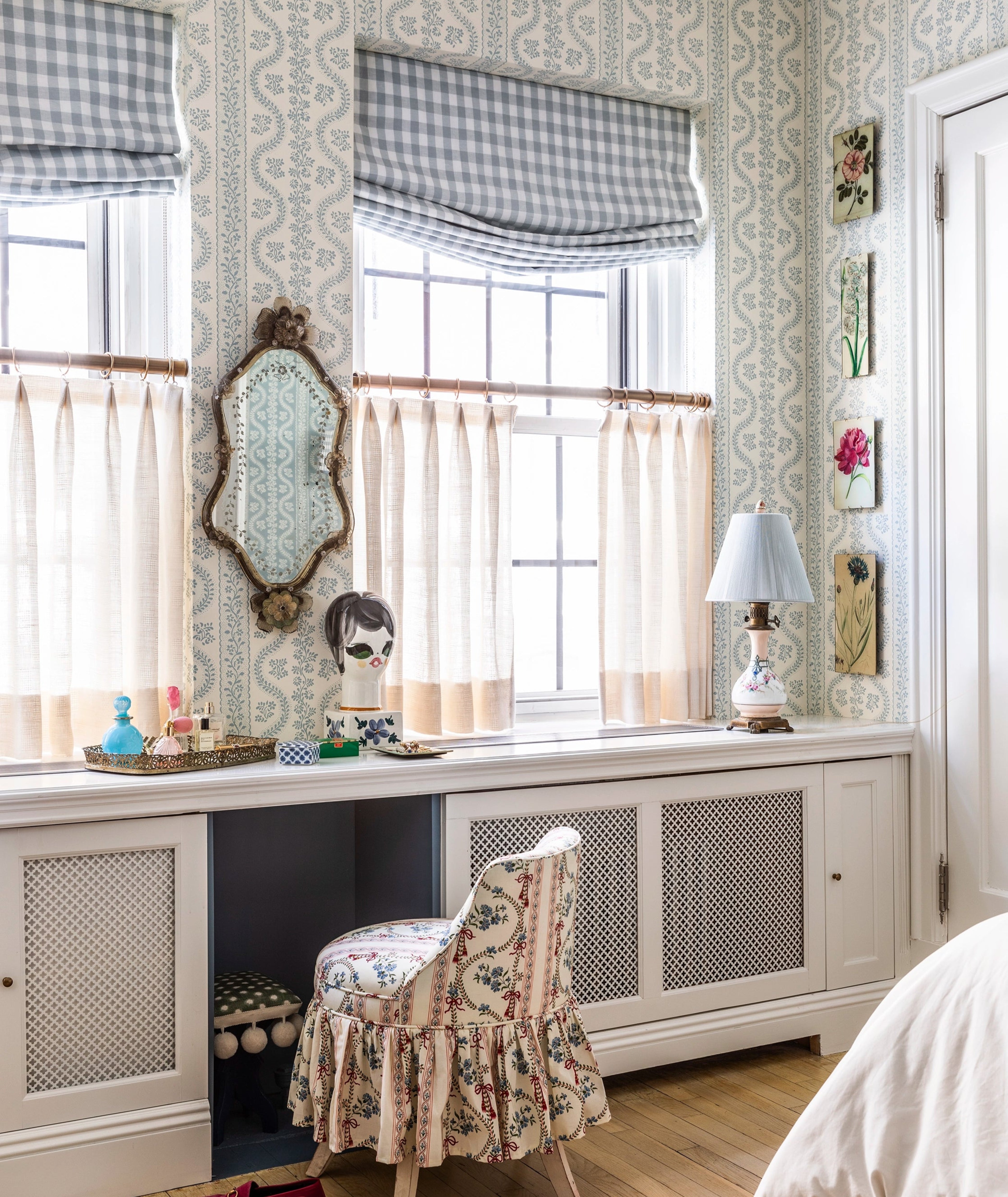 This second floor apartment in the West Village needed some brightening. We updated the drapery with a roman shade/cafe curtain combo. Cafe curtains provide extra privacy but still let the light shine through. We carved out a seating nook in the center of the radiator covers as an additional seating area separate from the sofa. Textiles are Pierre Frey.