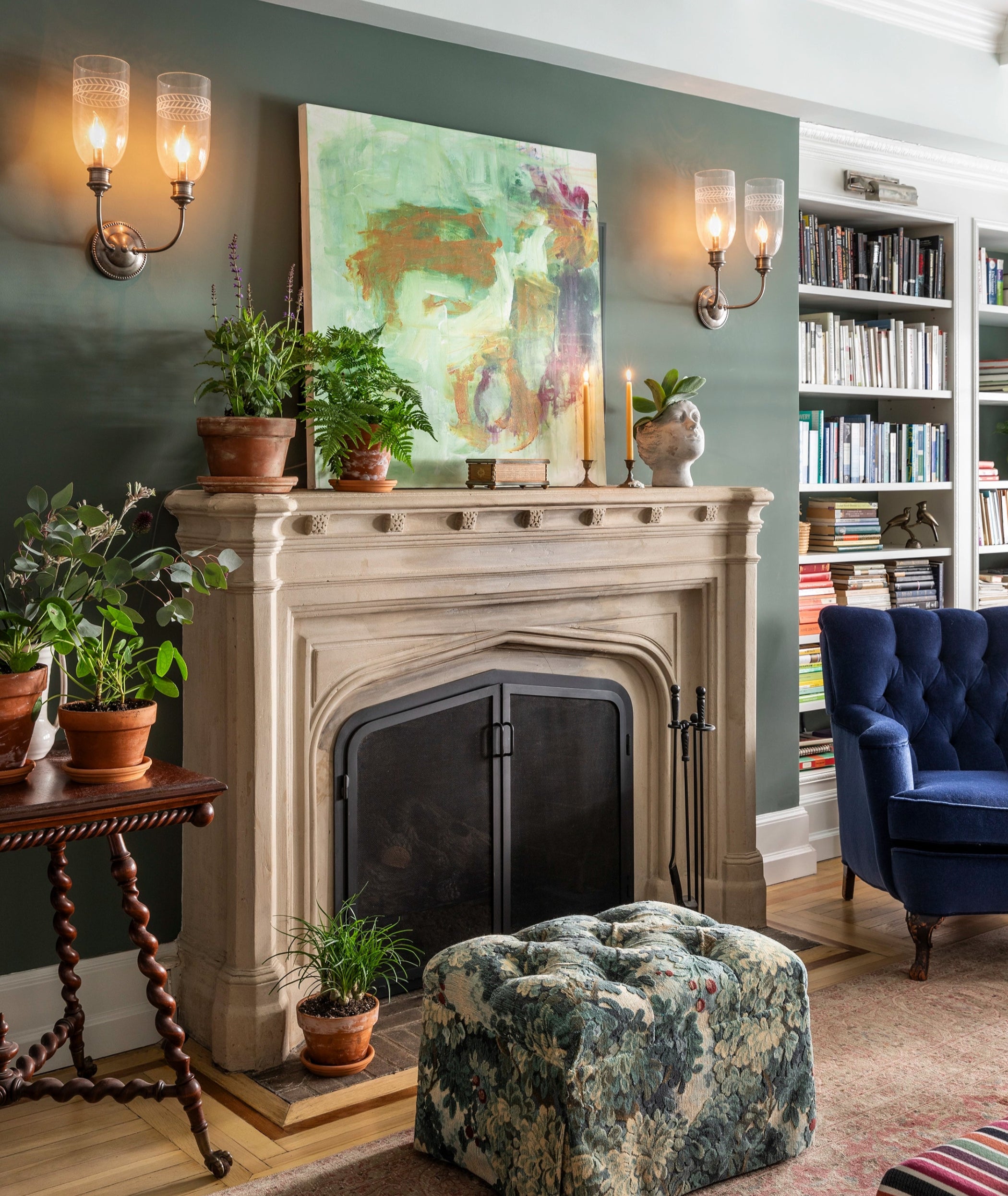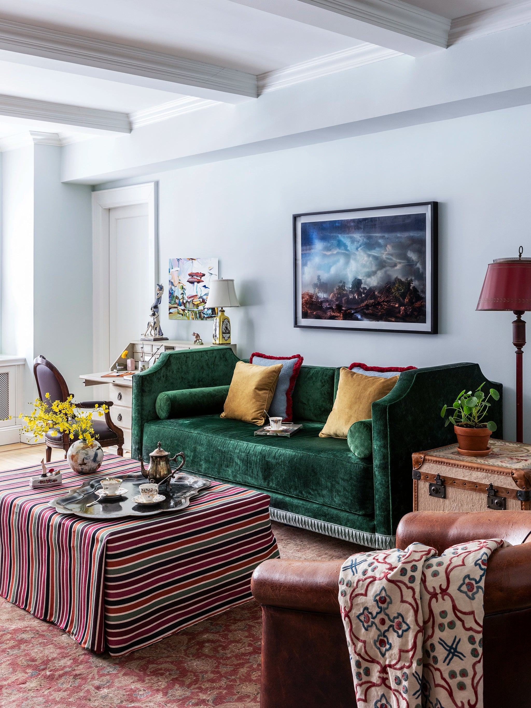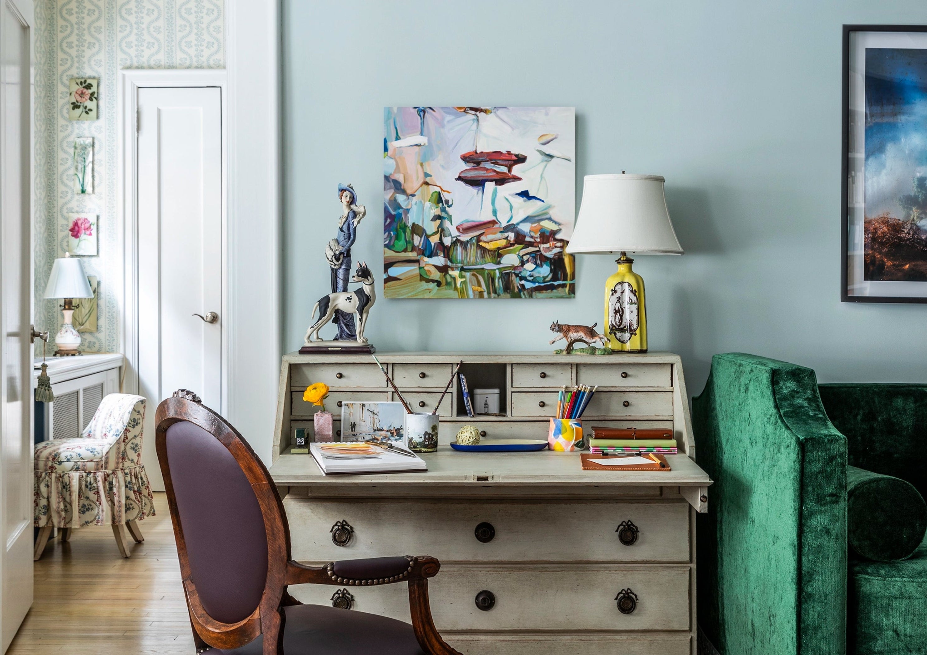 We reupholstered the existing sofa in a Holly Hunt green velvet. The secretaries desk is from Chelsea Textiles and serves as a work station with ample storage.